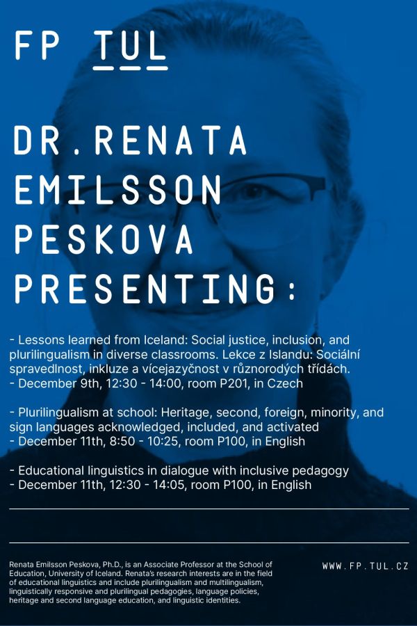 December 9th, 12:30 - 14:00, room P201, in Czech - Lessons learned from Iceland: Social justice, inclusion, and plurilingualism in diverse classrooms. Lekce z Islandu: Sociální spravedlnost, inkluze a vícejazyčnost v různorodých třídách.