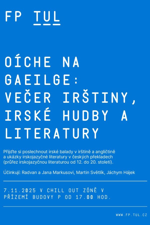 Come and listen to Irish ballads in Irish and English, as well as excerpts from Irish-language literature in Czech translation (a survey of Irish-language literature from the 12th to the 20th century).