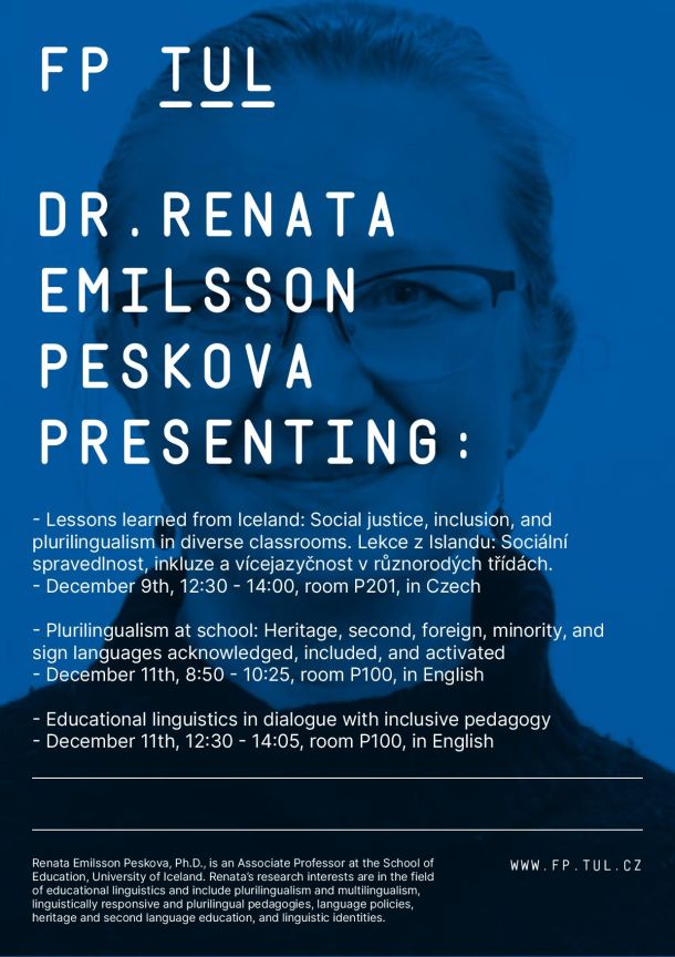 December 9th, 12:30 - 14:00, room P201, in Czech - Lessons learned from Iceland: Social justice, inclusion, and plurilingualism in diverse classrooms. Lekce z Islandu: Sociální spravedlnost, inkluze a vícejazyčnost v různorodých třídách.