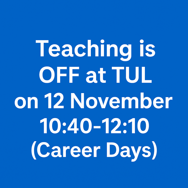By the decision of the Rector's Office, there is no teaching on 12 November 2025 from 10:40 till 12:15, i.e. teaching blocks 5 & 6.